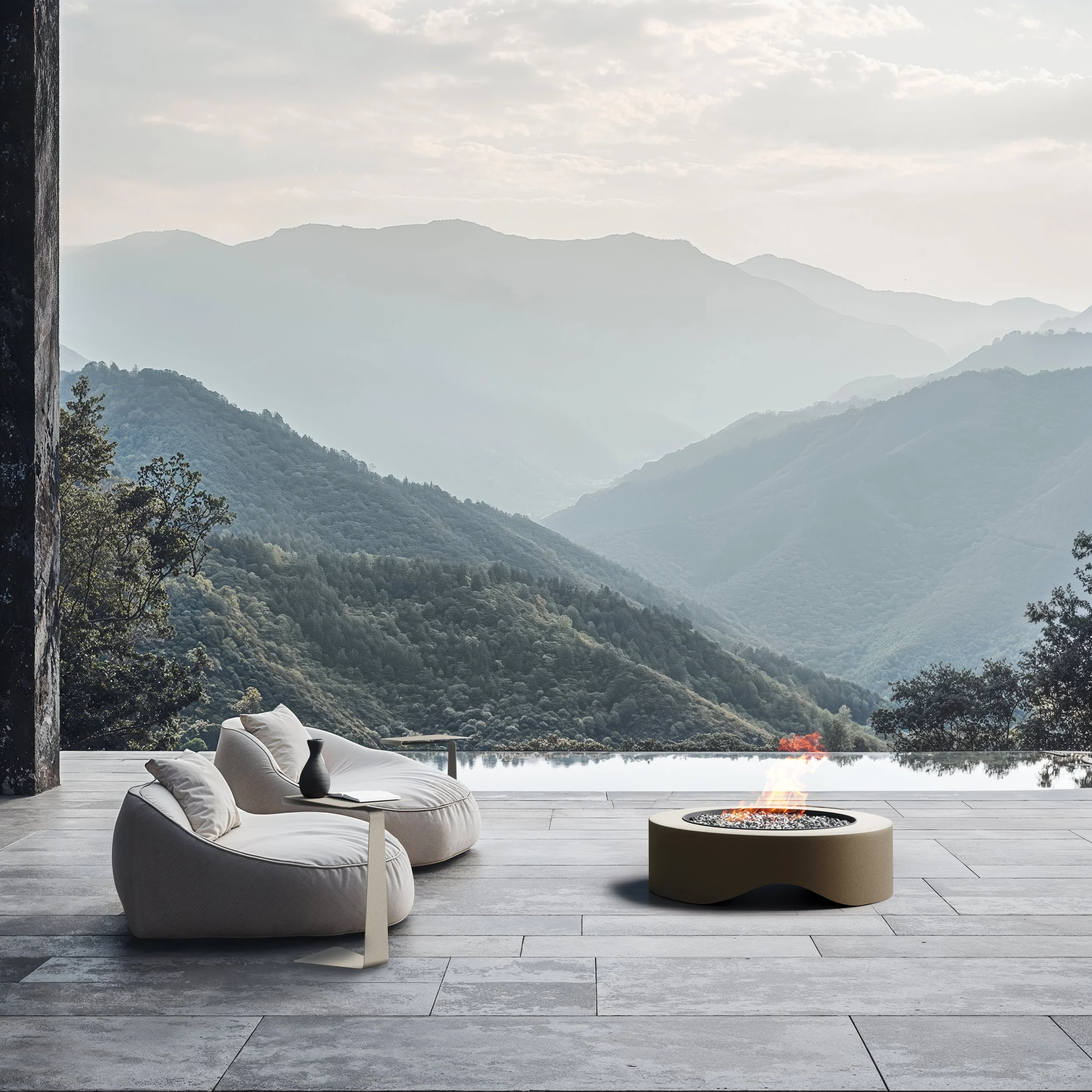 A sleek, cylindrical fire table designed for refined outdoor living. Its low-profile form blends effortlessly into any high-end setting, while the sculpted wave-like side detailing adds a balanced, artistic touch.